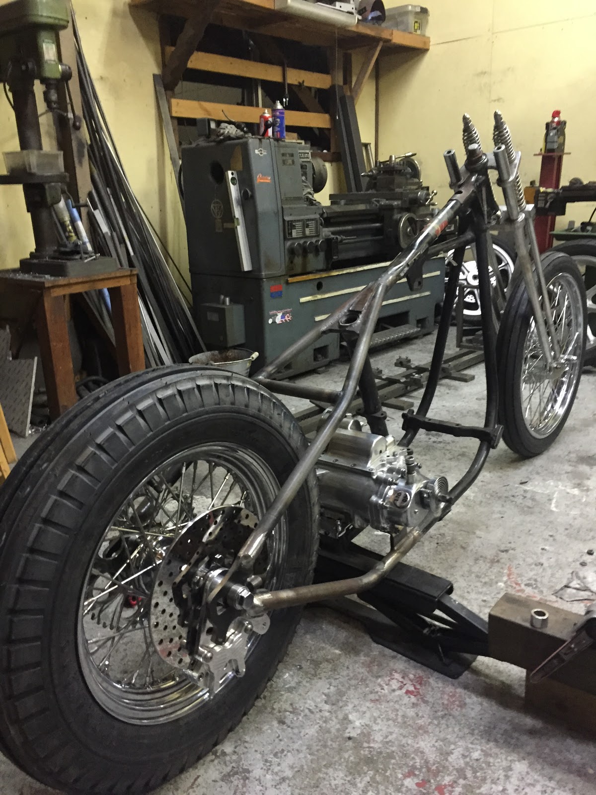 どーも!今年ももうわずかです。先日のスプリンガーの加工が完了してます。ノーマルネックなのでこんな感じの長さにしました。スプリンガーをカットしてフライス盤と旋盤を使い加工して溶接して磨いてあります。またクロームメッキするのであとは仮組み後に磨きます。オーナーも大喜びの長さ&シルエットになりました。お楽しみに〜❗️